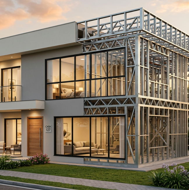 O steel frame é um sistema construtivo moderno que utiliza estruturas de aço galvanizado como forma de base de uma edificação, substituindo métodos tradicionais como alvenaria. As paredes, lajes e coberturas são montadas a partir de perfis leves de aço, combinados com placas de fechamento e isolamento.Entre os principais benefícios do steel frame estão a rapidez na construção, já que grande parte do processo é industrializado, a redução de desperdícios no canteiro de obra, e a maior precisão estrutural. Além disso, oferece excelente isolamento térmico e acústico, maior durabilidade (resistente a pragas e umidade) e é uma opção mais sustentável, pois gera menos impacto ambiental.